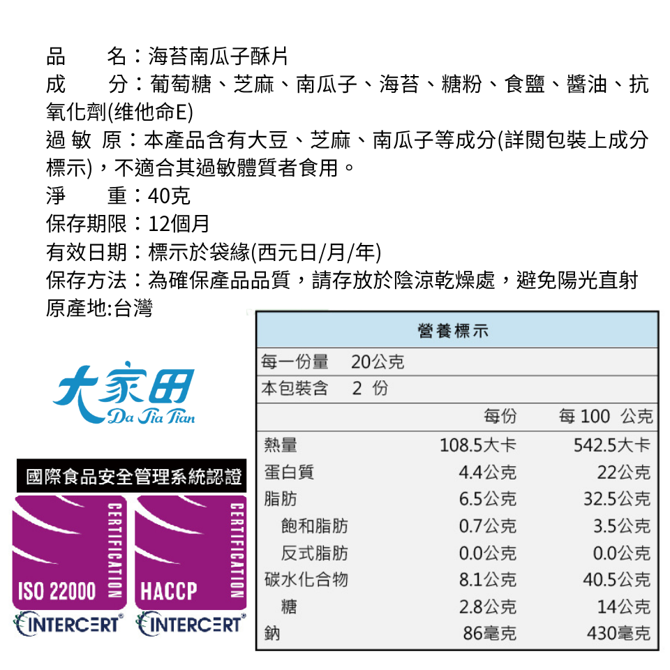 嚴選香酥海苔與南瓜子,雙層夾心,佐以濃郁白芝麻,獨特手藝烘烤,醞釀出香、酥、脆的口感。少熱量高纖維的海中綠金,搭配香甜可口的南瓜子與芝麻,以純手工精緻烘焙,無人工香料、無防腐劑,健康自然、薄脆好吃。